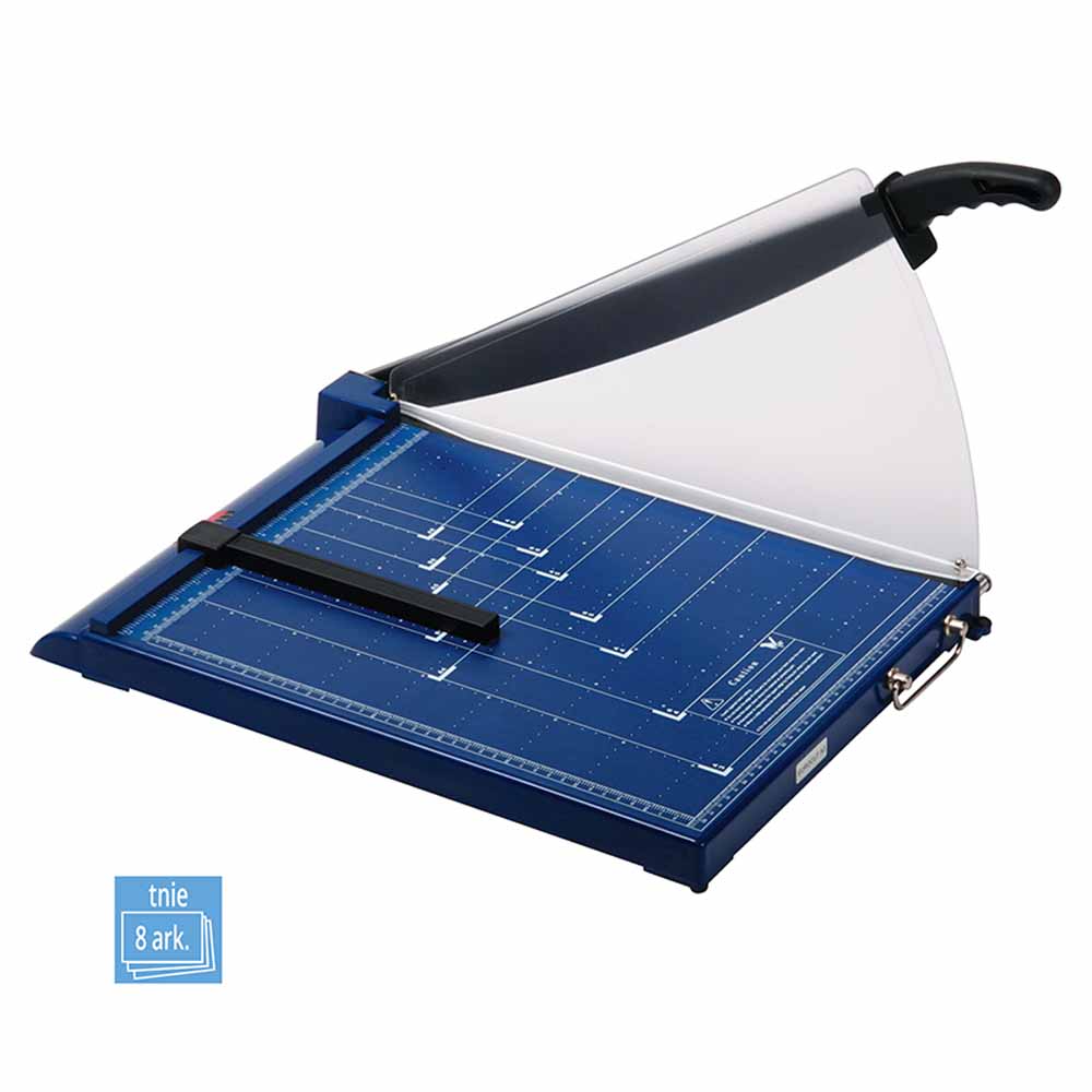 Gilotyna posiada precyzyjny ogranicznik do regulowania wymiarów cięcia, co pozwala na dokładne dostosowanie rozmiaru papieru do Twoich potrzeb. Blaty robocze z nadrukowanymi szablonami standardowych formatów ułatwiają szybkie ustawienie arkuszy, a jednorazowe cięcie do 40 kartek (70g) pozwala na sprawne przetwarzanie dużych ilości dokumentów.