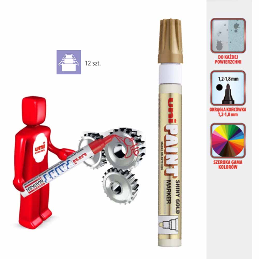 Marker olejowy UNI PX-30, w kolorze złotym, to niezastąpione narzędzie do znakowania wszelkiego rodzaju powierzchni: szorstkich, gładkich i tłustych. Bez względu na to, czy pracujesz z metalem, szkłem, kamieniem, plastikiem, styropianem czy drewnem, UNI PX-30 zapewnia wyraziste i trwałe oznaczenia.