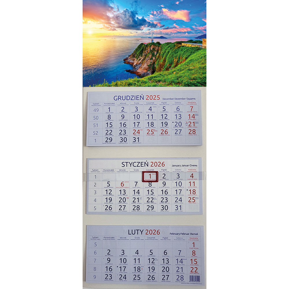 - kalendarium: PL/EN/DE/RUS/FR, imieniny i święta, fazy księżyca i zachody słońca, na dole kalendarium plan całego roku