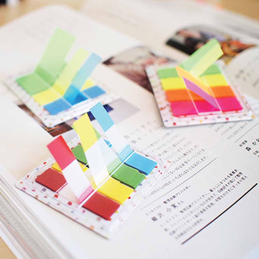 Podajnik z zakładkami można przymocować do różnych powierzchni dzięki taśmie na jego odwrocie, co zapewnia łatwy dostęp do zakładek w każdej chwili. Dyspenser umożliwia wyciąganie zakładek jedną ręką, co jest niezwykle praktyczne podczas pracy. Zakładki są półprzezroczyste, co pozwala na zaznaczanie bez zasłaniania oryginalnych treści.