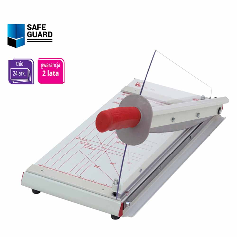 Blat roboczy gilotyny wyposażony jest w antypoślizgową podstawę, co gwarantuje stabilność podczas pracy. Plastikowa osłona zabezpieczająca oraz ergonomiczny uchwyt dodatkowo zwiększają komfort i bezpieczeństwo użytkowania, minimalizując ryzyko przypadkowego skaleczenia.