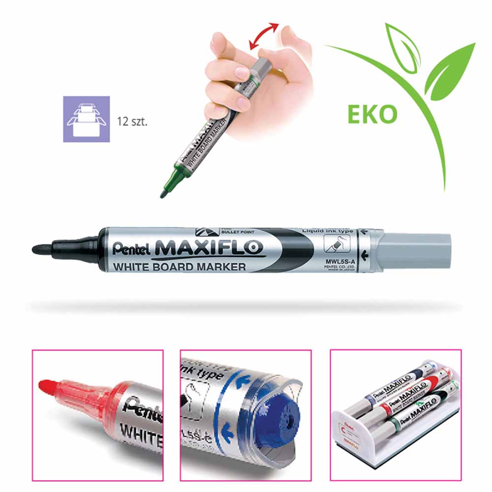 Marker do tablic suchościeralnych Pentel MW85 wyposażony jest w okrągłą końcówkę, która zapewnia precyzyjne i płynne pisanie. Idealny do prezentacji, notatek i rysunków na tablicach suchościeralnych.