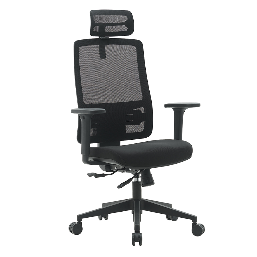 wygodny fotel biurowy z pokryty ekoskórą, tapicerowany w klasyczne, poziome pasy miękkie, wypełnione pianką siedzisko mechanizm motylkowy (TILT) dający możliwość swobodnego kołysania oraz blokady pozycji do pracy stałe podparcie lędźwiowego odcinka kręgosłupa chromowane podłokietniki z miękkimi nakładkami zapewniająca stabilność pięcioramienna, stalowa, chromowana podstawa podnośnik gazowy (siłownik): 100 mm kółka nylonowe, twarde, do wszystkich typów podłóg - średnica 50 mm materiał: ekoskóra wysokość krzesła: 108- 118 cm regulacja wysokości siedziska w zakresie: 47,5 – 57,5 cm szerokość oparcia: 48 cm wysokość oparcia: 64 cm szerokość siedziska: 51 cm głębokość siedziska: 44 cm średnica podstawy: 64 cm maksymalne obciążenie: 110 kg rekomendowany czas siedzenia: do 8 godzin dziennie gwarancja: 2 lata kolor: czarny