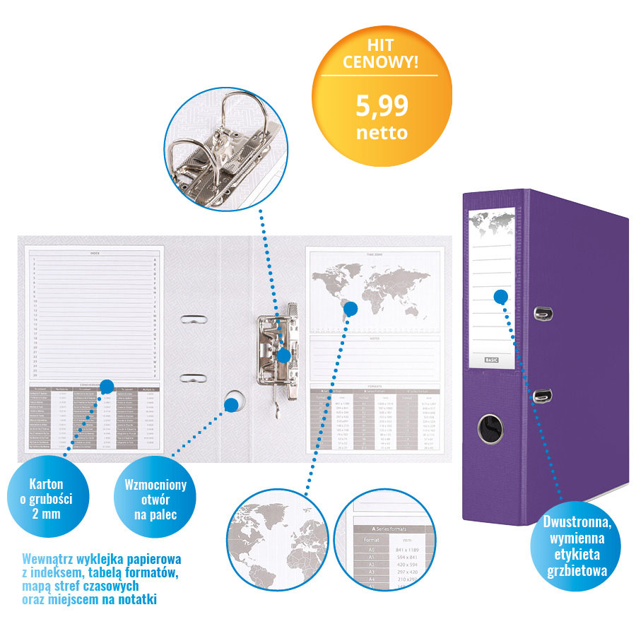 • z metalową blaszką skoroszytową oraz 4 dziurkami umożliwiającymi wpięcie wąsów do segregatora