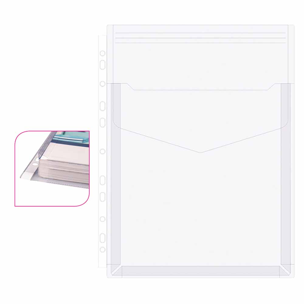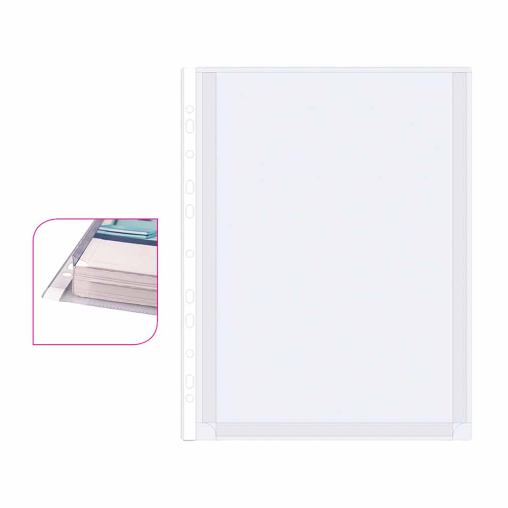 - z lewej strony koszulki znajduje się wzmocniona perforacja, która umożliwia wpięcie koszulki do każdego rodzaju segregatora